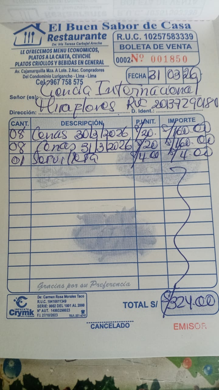 | #PO-067-ADM- ATENCION DE ALIMENTOS PARA EL PERSONAL DE TURNO 30 Y 31 DE MARZO 2026 [CARBAJAL … | PEN | 324.000000 |
